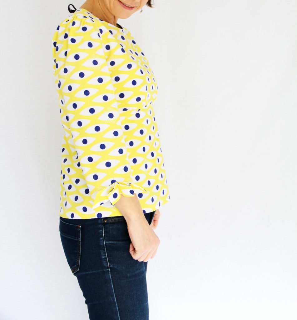 Ayant envie d’arborer fièrement et rapidement ma réalisation avec ce tissu (la couleur en hiver est toujours une bonne idée), j’ai cherché un modèle que je pourrai porter aussi par temps frais. Mon choix s’est arrêté sur le dernier patron de Vanessa Pouzet, Haut Vol. Il s’agit d’un top manches 3/4, dos ouvert avec une FE séparable (ce qui fait tout son charme), mais je me suis dit qu’avec un gilet chaud, je n’aurai pas froid.