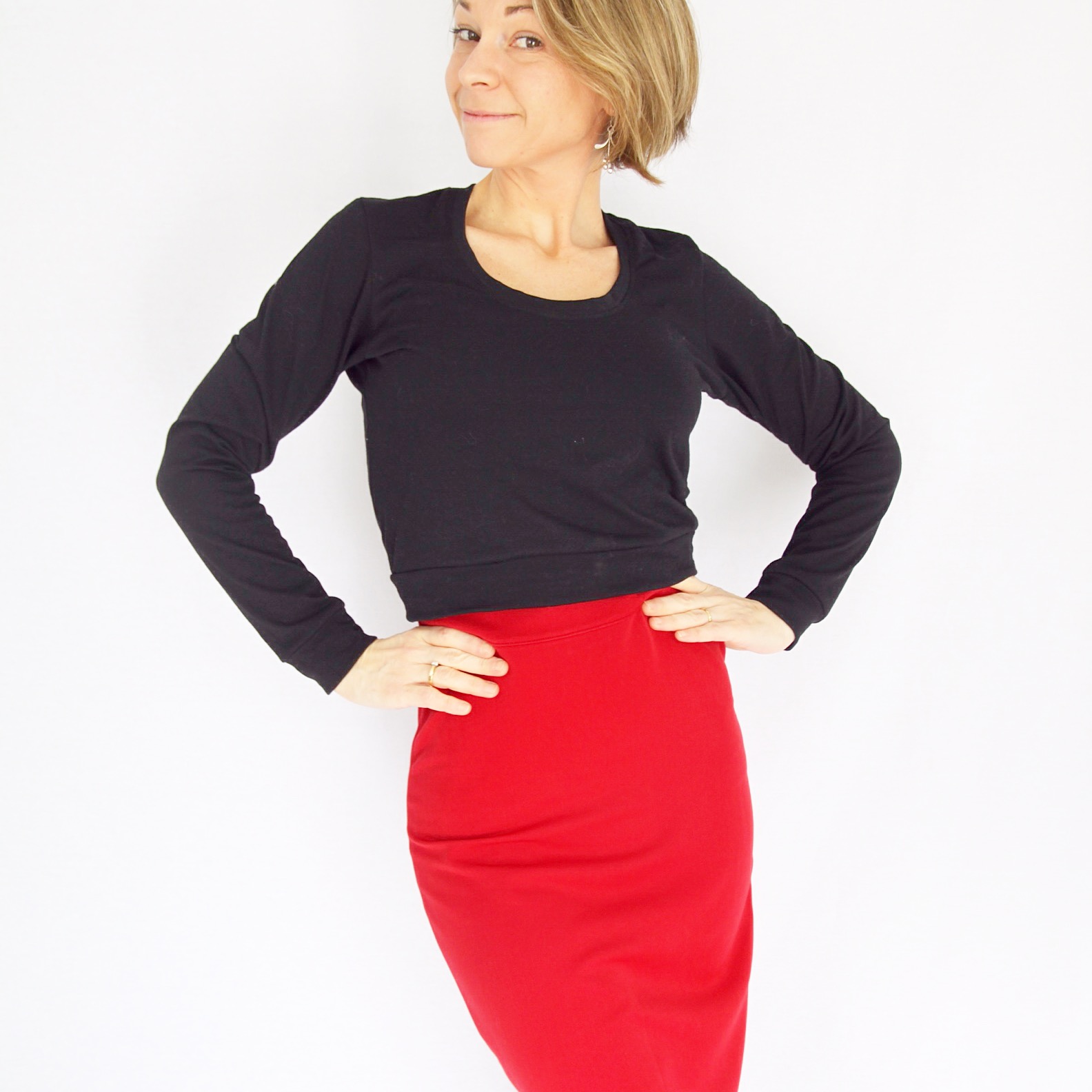 Ainsi que je peux vous présenter les cousettes du jour, des tenues que j’aime mais porte peu (même très très peu) et qui sortent du style de ma garde-robe habituelle : jupe crayon près du corps Kristy de la maison Victor et Sweat Ondée de Deer&Doe.