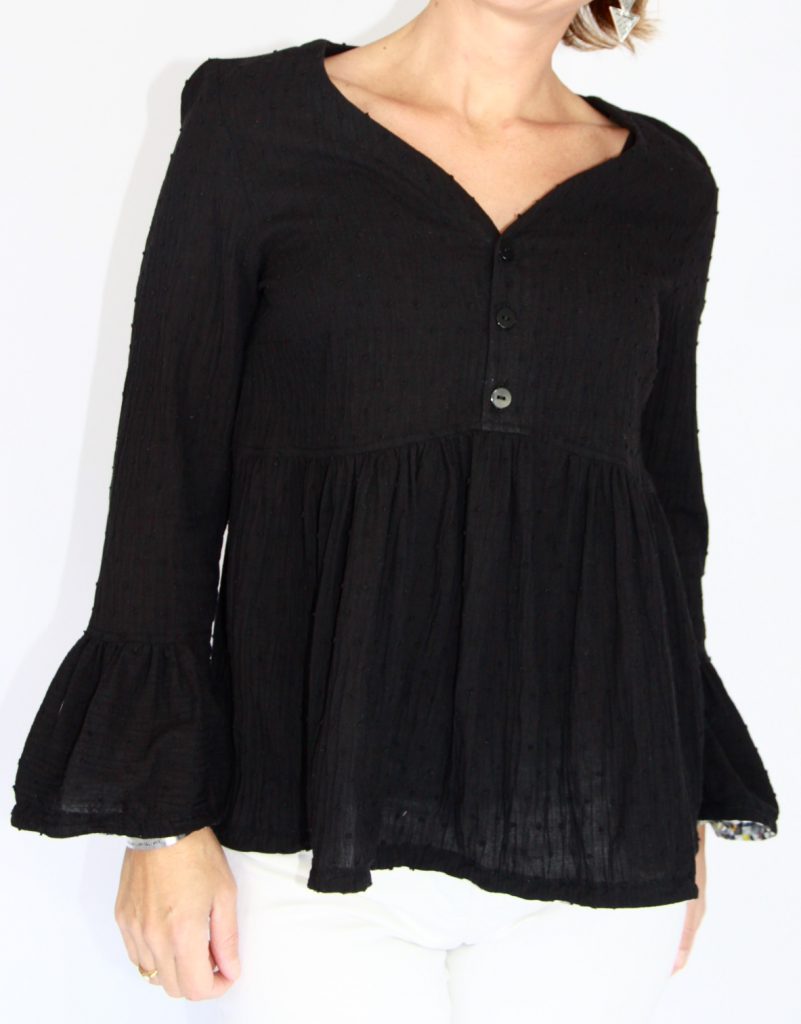 La Désinvolte, la blouse qui me correspond le plus en ce moment… C’est en constatant qu’actuellement les vêtements que je portais le plus, étaient des blouses ou robes amples, que j’ai imaginé cette petite. Toujours dans la fémininité avec sa jolie encolure, un brin de raffinement avec la boutonnière, un maximum de confort avec une coupe ample, dans l’air du temps avec ses basques et volants, elle se pose sur nous, vit sa vie au gré du souffle du vent… Non, je vous rassure, vous ne finirez pas nue au milieu de la place en cas de vents forts, mais cette petite a le don de se faire oublier grâce à son confort et sa légèreté…