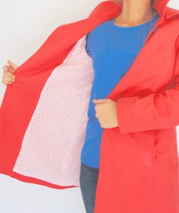 Quant à moi, je suis hyper contente de m’être attelée à nouveau à la réalisation de ce patron car il remplit définitivement tous mes critères : féminin, élégant, le cou protégé du vent par le col et la capuche, qui s’avère encore plus agréable par temps de pluie. Je n’arrive pas encore à choisir entre ce patron et d’autres pour les couleurs dont je vous parlais plus haut. Ce modèle est parfait pour moi, mais je me lasse de le coudre… j’en ai quand même réalisé 5 avec les 3 versions hivernales présentées ici…. et je ne compte pas les prototypes… Moi qui souhaite également un manteau d’hiver bordeaux/rouge…. va falloir que je me décide !