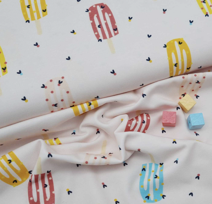 TTC/M. Jersey bio motifs glaces ; il est parfait pour des body, tee-shirts, robes cache-coeur, pantalon enfants etc.. Tombé lourd et souplesse moyenne de part son tissage serré qui en fait un jersey agréable à coudre et moins sensible aux déformations, distensions.