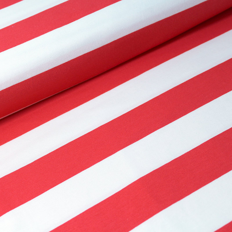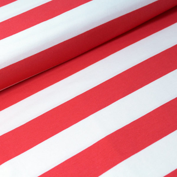 TTC/M. Jersey coton Bio marinière large rouge – blanc cassé, qualité supérieure ; il est parfait pour des body, tee-shirts, robes cache-coeur, pantalon enfants etc.. Tombé lourd et souplesse moyenne de part son tissage serré qui en fait un jersey agréable à coudre et moins sensible aux déformations, distensions.