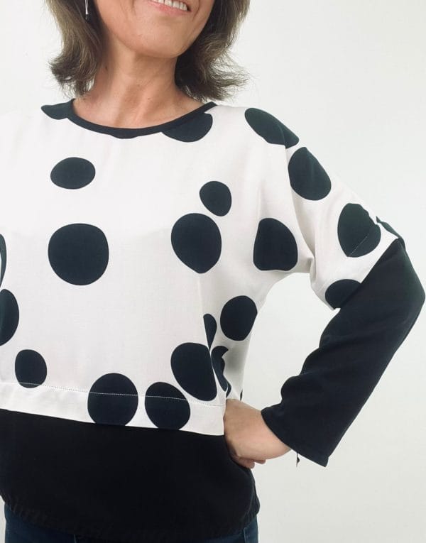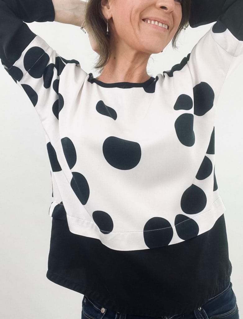 Patron de couture Easy Top 2 : un modèle simple aux lignes épurées, avec ou sans manche, accessible à la majorité. Un jeu de plis et empiècements pour lui donner son identité. A vous de jouer pour lui conférer votre style et caractère avec votre choix de tissus dans cet article ICI.