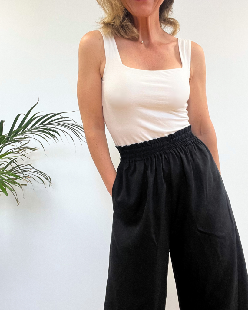 Patron de couture Rêve : Pantalon large, inspiration jupe culotte, taille haute élastiquée attenante, fourche basse et poches dans la couture. Un bonheur à porter et simple de réalisation. La ceinture est un élément rajouté avec mes chutes de tissu .